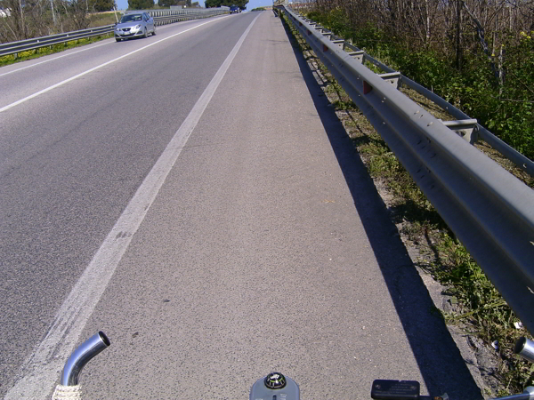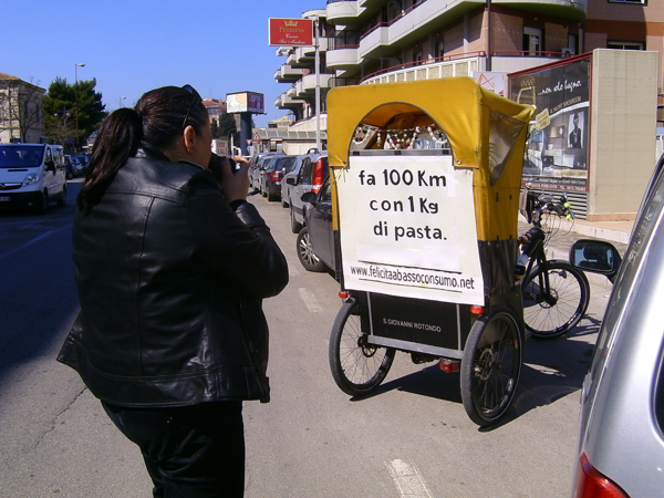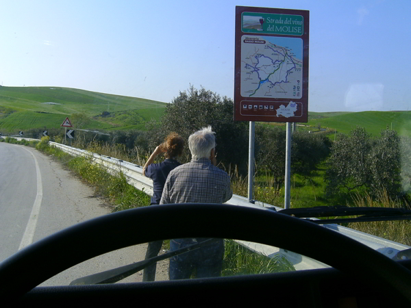 Nell'area industriale a sud della città mi sono fermato a chiedere dove poter far stampare la scritta, e sono stato indirizzato verso viale Padre Pio, da "Neografica". Lungo la strada collinosa che mi è stato raccomandato di seguire, e che porta all'ospedale, ho incontrato due poveri disoccupati, che sorseggiando una birra mi chiedevano se potevo offrire loro un lavoro. Devo dire che, anche se l'avessi avuto... non saprei dire se bere birra alle 11 di mattino è un segno di buona volontà.
