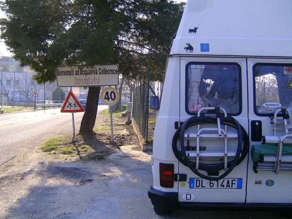 Non è un salotto alto-borghese, ma la biblioteca civica di Acquaviva Collecroce! Dopo aver comprato vino ed olio direttamente dai produttori, abitanti del villaggio, siamo rotolati ripidamente giu a valle e proseguito nell'oscurità verso Termoli fino alla via Riovivo, abbiamo cenato sul camper parcheggiato per la notte, e questo era quanto per oggi. |