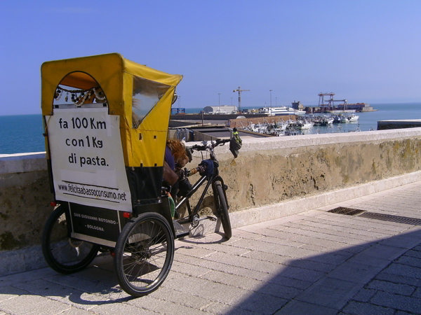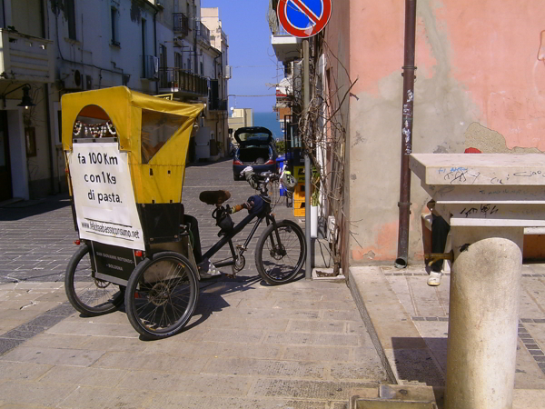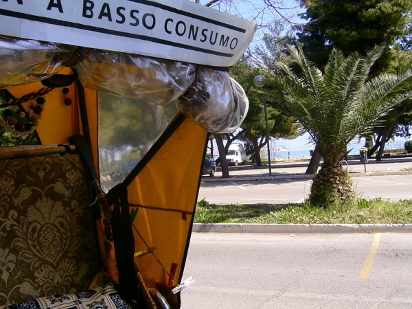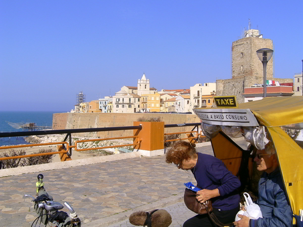 I l risciò è rimasto parcheggiato in un terrazzino a fianco dell'Hotel, di cui una stanza mi ha accolto con un confortante sottofondo di linea ferroviaria. A metà mattinata dopo la colazione in camper ero pronto a lasciare il parcheggio-area sosta di Riovivo sul risciò, portando il mio bagaglio, i miei genitori e me stesso su verso il centro storico di Termoli.