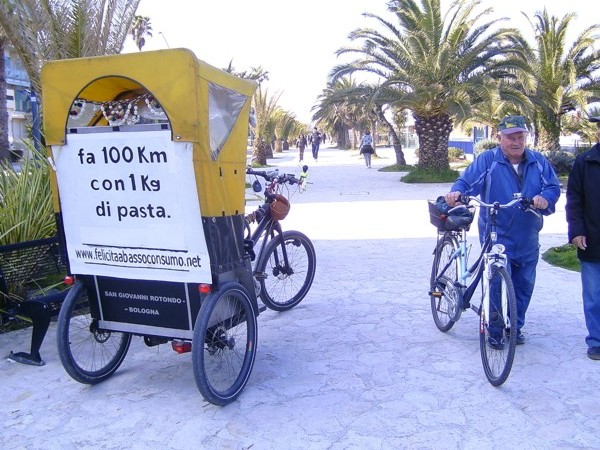 Nella città ho incontrato un meccanico di biciclette, che mi ha consigliato in questioni tecniche riguardanti il miio risciò, ho notato che rispetto alle altre regioni che ho visitato, qui si incontrano meccanici che hanno già avuto esperienza di veicoli a pedali diversi dalle due ruote. L'albergo che stavo cercando, mi è stato detto, si trova parecchio fuori da Cupra marittima, ma è nella mia direzione, sulla statale Adriatica in località Marina di Massignano. La pensione "il Contadino" mi ha affidato una stanza, e mi ha fatto parcheggiare il risciò nel garage sotterraneo. Nella grande sala da pranzo ho consumato una cena leggera - brodo di verdure -, e bevuto acqua proveniente dal Parco Naturale di monti Sibillini. |