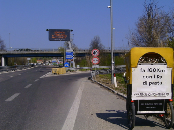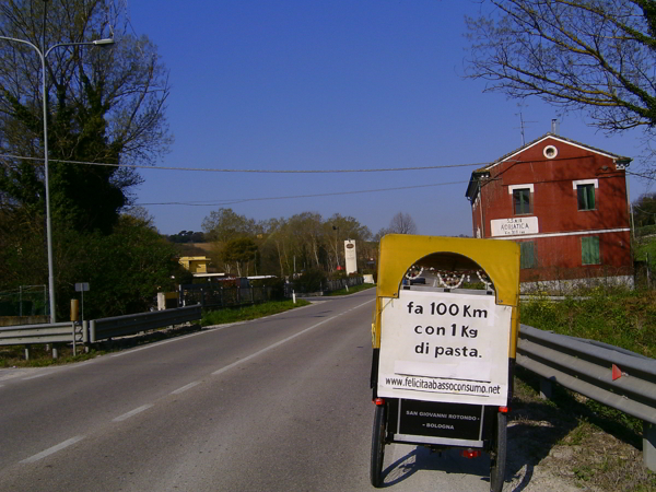 "Il mattino ha l'oro in bocca", e prima che venisse caldo ho pensato di lasciare Loreto e pedalare ancora in mattinata fino ad Ancona. tornato nella Casa Accoglienza ho preso la colazione, consistente in caffelatte con le fette biscottate e la marmellata, e alla svelta ho allestito il risciò per ripartire, mentre un gruppo di anziani pellegrini provenienti dalla provincia Laziale si radunavano lentamente nel grazioso giardino antistante per ripartire con il loro autobus. È seguito un quarto d'ora di corroborante discesa giù da Loreto fino a ricongiungersi con la Statale 16.