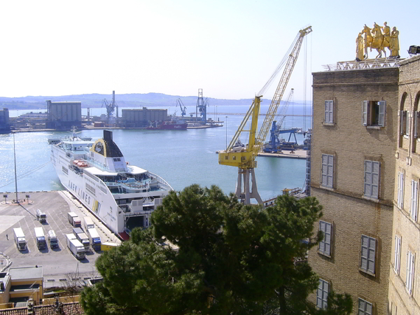 mentre sulla sommità del palazzo stesso si ammira la riproduzione dorata di un voluminoso gruppo scultoreo equestre risalente al Picenum di epoca romana, conosciuti come Bronzi di Cartoceto, quasi una citazione dei Bronzi di Riace ma nelle Marche invece che in Calabria, e con alle spalle simili diatribe fra chi vorrebbe gli originali bronzei in un museo grande e metropolitano, e chi li lascerebbe nel modesto museo locale sorto vicino a dove sono stati ritrovati. Le copie dorate comunque donano proprio tanto al paesaggio portuale, e con gli originali di lasciarli fuori alle intemperie non avrebbero potuto farlo.