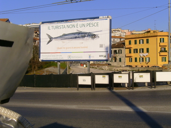 Verso il tardo pomeriggio sono ritornato in piazza della repubblica, dove presso l'ufficio per i turisti all'inizio di via Gramsci, sono stato indirizzato verso un albergo non lontano dalla stazione ferroviaria. Mentre mi allontanavo da Piazza della Repubblica, notavo una folla di giovani, che aspettavano di entrare al Teatro delle Muse per assistere ad un concerto pianistico di un noto giovane concertista, un certo Giovanni Allevi. Qualcuno si lamentava con me del prezzo eccessivo del biglietto. Lungo la via Marconi, che su un manto stradale piuttosto dissestato mi conduce infin al calar della sera all'albergo, mi colpisce un manifesto pubblicitario che invita con la semplice battuta "Il turista non è un pesce, dopo tre giorni è ancora buono" gli esercenti di Ancona a non fare del turista occasionale una acquirente usa e getta, da sfruttare una volta e mai più, ma di creare convenienza in modo da invitare il turista a ritornare, e a fermarsi piu a lungo.