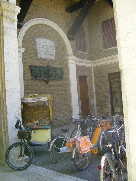 C'era un capannello di uomini di sembianze asiatiche e parlata indo-romagnola, a cui ho chiesto di spiegarmi dove dirigermi per gli alberghi alla mia portata. È sopravvenuto in quel mentre un ometto dall'aspetto distinto ed una cravatta blu, che di punto in bianco ci ha argomentato con cognizione di termini della necessità di mettere un motorino alle bici per affrontare ostacoli come i sottopassaggi marchigiani sotto la ferrovia [problema che peraltro a Pesaro non si pone tanto, perchè il cavalcavia con i cambi di velocità pian pianino lo si fa pedalando].