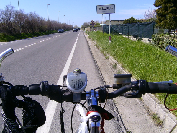 Ormai lasciando Fano e dirigendomi verso la pista ciclabile costiera, notavo segni inconfondibili che ero entrato nell'area culturale che gli archeologi del futuro chiamerebbero "la cultura del pedale", cioè zone, da qui verso nord nella "Gallia cisalpina", ove c'è da tempo un mercato per determinate merci, come seggiolini per neonati sul portapacchi della bici, o parabrezza con paramani per il manubrio della bicicletta. Queste cose potevo notare dirigendomi dal centro di Fano verso la pista ciclabile che affianca la linea ferroviaria a monte.