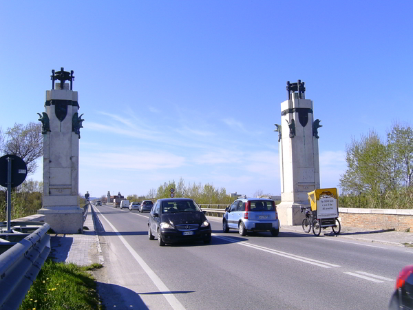 Difatti ancora poche pedalate, quando oltre una rotonda di traffico si scorgono le monumentali colonne di marmo e bronzo del ponte sul Metauro. Si tratta di un'opera in stile fascista, atta a ricordare la battaglia che qui ha avuto luogo migliaia di anni fa fra Romani e Cartaginesi.