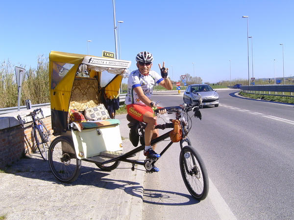 Mi racconta del suo progetto di mettere insieme una bicicletta a tre ruote che si cavalca sdraiati e con una cabina sopra come la carrozzeria di un'auto, per poter andare anche d'inverno in bicicletta quando piove e tira vento. è un tasto dolente della mobilità in italia, perchè - confrontando i grafici metereologici e pluviometrici - soprattutto nell'italia peninsulare le precipitazioni sono in complesso meno rare che nell'Europa continentale, per contro però sono sovente molto più violente, accompagnate da vento, perduranti per giorni e per lo piu coincidenti con la stagione più fredda.
