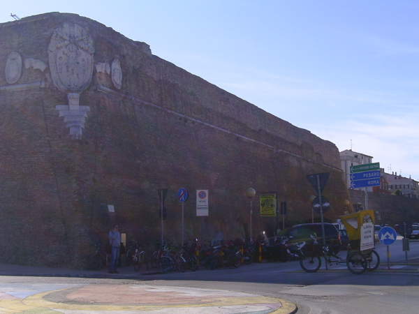 Oltrepassato il ponte sul Metauro in breve sono giunto allo spigolo meridionale delle mura della città, una grande costruzione di mattoni contrassegnata alla sommità da un grosso stemma di marmo su cui sono scolpite due grosse chiavi.