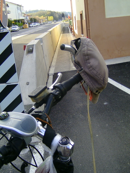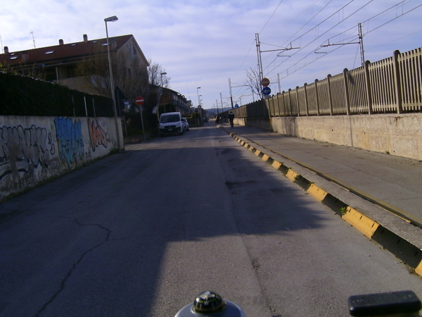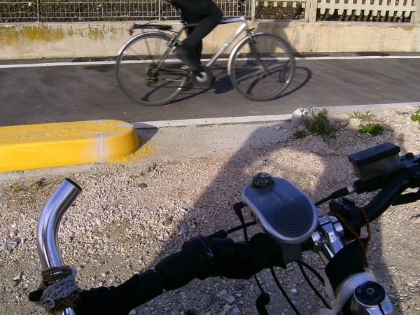 Va beh, dopo un po' ho scovato uno spazio piu largo del normale lungo il dosso, e ho seguito la pista ciclabile come tutti gli altri ciclisti. Senonchè ad un tratto la corsia diventa troppo stretta, saranno 80 cm, e non mi rimane che ritornare ad allargarmi sulla carreggiata delle automobili.