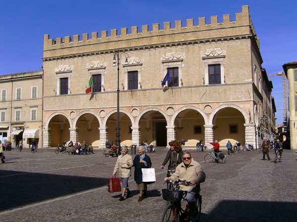 Sono tornato a Piazza del Popolo, che è il centro geografico della città e sede del palazzo ducale dalla sommità merlata. Qui potevo notare -come già a Senigallia- ancora una volta la mole di traffico ciclistico in questo estremo lembo di italia peninsulare.