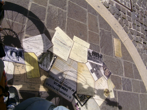 Fra le cose di Pesaro che mi hanno colpito e che non sono necessariamente indicate negli opuscoli e opuscoleti informativi per i visitatori, c'è un particolare che ogni Pesarese calpesta passando per piazza del Popolo: si tratta di alcune piastrelle inserite a bella posta nel lastricato stradale, su cui sono stampate alcune pagine di pubblicazioni stampate nella città di Pesaro, che testimoniano l'adesione alle leggi razziali emanate nel 1940 in italia. Fra di esse la pagella di un bambino "di razza semita".