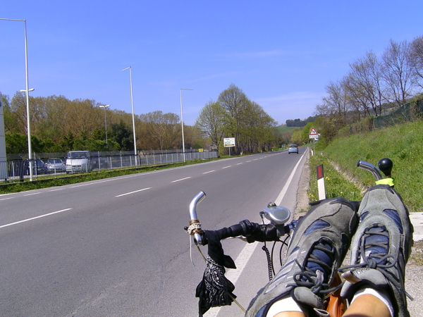 La statale prosegue costeggiando a sud l'area del parco naturale. Alla mia sinistra la campagna circostante consta di una zona collinosa più alta ricoperta di una coltura di grano ancora giovane, mentre attorno alla strada crescono caducifoglie proprie dell'Europa continentale, oltre a cipressi che evidentemente sono stati da poco potati; infatti c'è per aria un odore forte di resina. A Cattabrighe sono visibili i primi segnali stradali che indicano la meta finale del mio viaggio, Bologna.