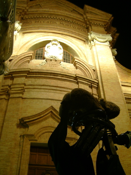 In piazza Cavour c'è stata una breve discussione con alcuni tassisti che qui hanno la loro stazione di attesa. i due servizi di trasporto di TAXI e RISCIÓ comunque non si intersecano, l'uno veloce e per lunghe distanze, l'altro più lento e per brevi distanze I tassisti sembrano inoltre timorosi che l'amministrazione comunale si lasci andare ad atti di populismo comprando veicoli e pagando personale per un trasporto cittadino più ecologico, e la mia presenza nella piazza del municipio viene avvertita come un "suggerimento" sconveniente all'assessore competente (il quale casualmente in quel mentre passa camminando poco lontano). Per quel che riguarda invece il traffico ciclistico privato, ho immortalato almeno uno di diversi carinissimi accessori per biciclette, come parabrezza, seggiolini e portapacchi con design moderni e accattivanti. Percorrevo intanto corso d'Augusto alla ricerca del famoso Tempio Malatestiano, che nel libro di storia dell'arte del liceo campeggiava nel capitolo sull'architettura del Rinascimento.