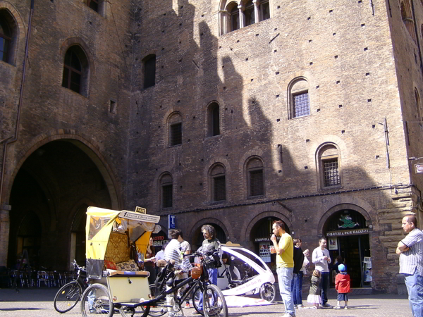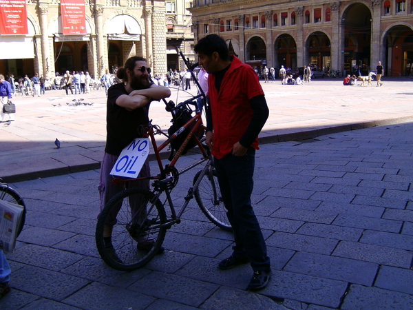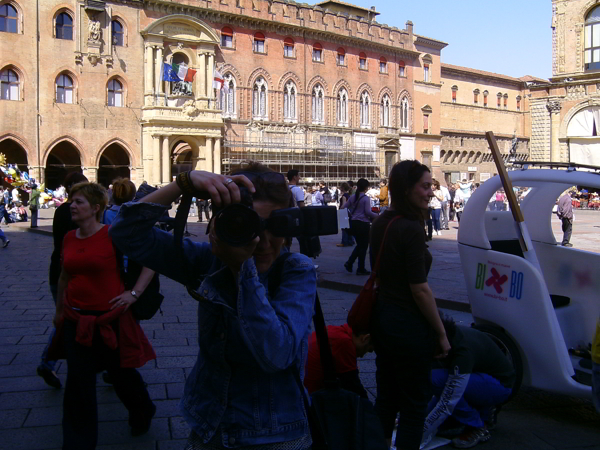 al trasporto personale alternativo, ha destato l'attenzione dei passanti e dei turisti che affollavano piazza Maggiore. E chi non si sarebbe incuriosito vedendo una bicicletta gigante costituita da due telai fusi l'uno sopra l'altro?