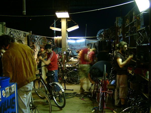 È un genere di luogo di cui avevo già spesso sentito parlare, scaturito come in diverse città del norditalia dalla cultura della condivisione di risorse e competenze propria dei centri sociali. Qui si tratta di un'ampia officina dove in una sezione ci sono ordinati per genere su diversi scaffali i vari pezzi che compongono una bicicletta, raggi, cerchioni, pedali, manubrii corone, ecc. e che viene frequentato veramente da ogni sorta di persone, che portano una bicicletta di cui non hanno piu bisogno o per cui non hanno piu spazio in garage, altre che invece ne cercano una e unendo i pezzi buoni delle bici lasciate qui possono con un po' di lavoro portarne via una propria, altre ancora che vengono a riparare la propria sostituendo dei pezzi, o ancora a fare delle modifiche bizzarre (si veda per esempio la No-Oil-giant-bike guidata oggi dal giovane regista L.Ártami), o delle creazioni su ruote mai viste prima, come il banchetto nuziale viaggiante.