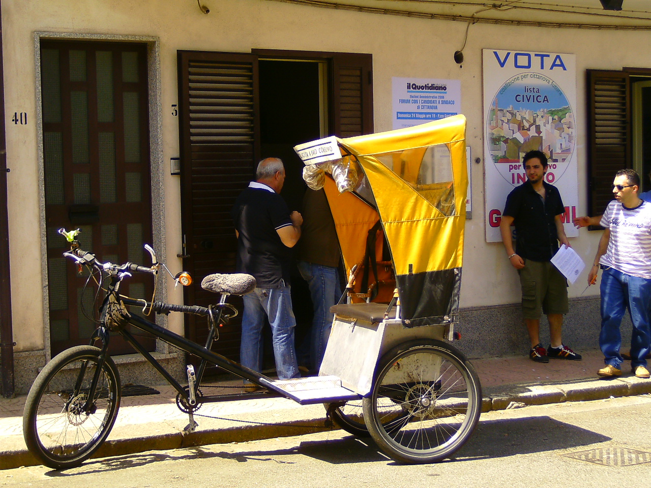 Negli scorsi due anni ho soggiornato diverse volte per periodi piu o meno lunghi a Cittanova, traslocandovi anche una parte della mia attività artistica. Il risciò è rimasto sempre con me, e in alcune occasioni l`ho usato con grande gioia mia e di chi ne ha usufruito: scarrozzando per il paese il mio nonno centenario, durante le festività cittadine, come propaganda ambulante per una lista civica durante le elezioni amministrative del 2009.